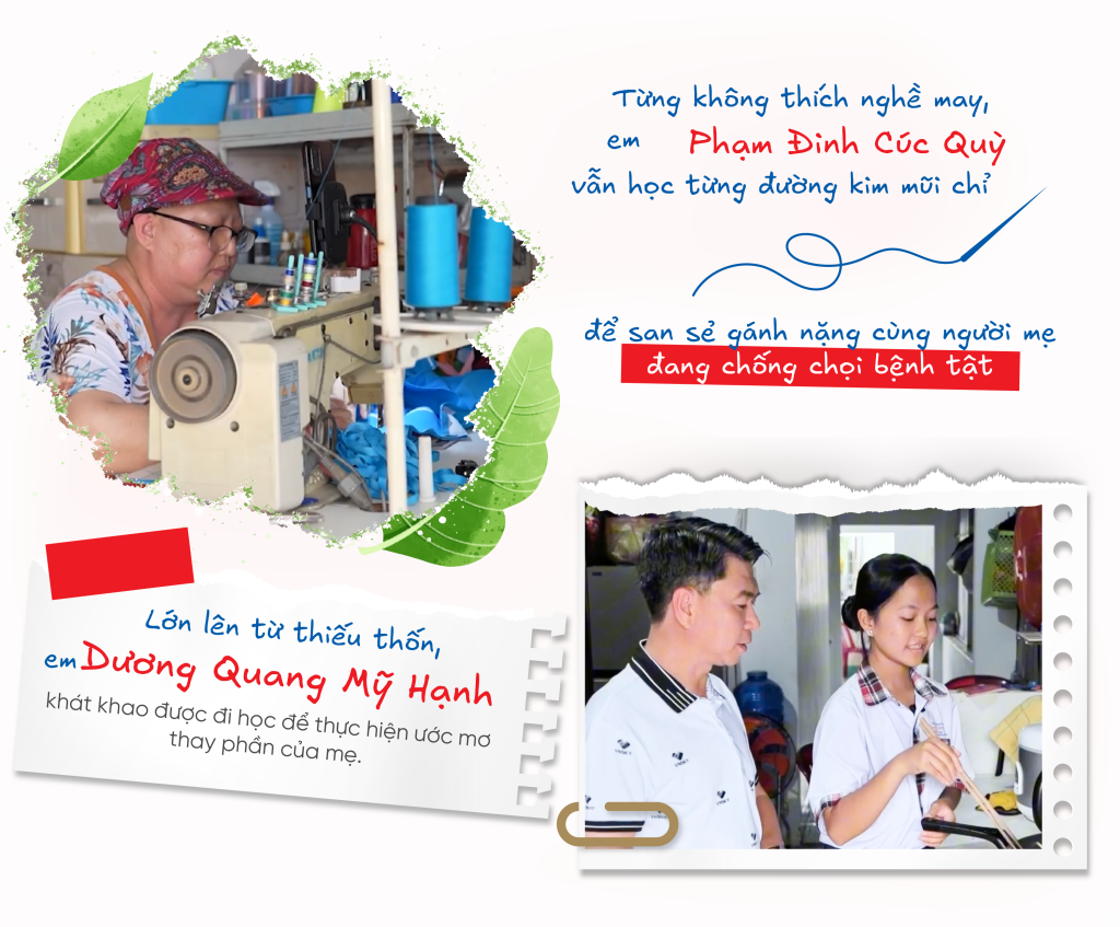 Ở Cà Mau, em Phạm Đinh Cúc Quỳ lớn lên trong căn nhà nhỏ luôn vang lên tiếng máy may cũ. Không có bố cạnh bên, mẹ em dù mang trong mình căn bệnh ung thư vú giai đoạn cuối, vẫn gắng ngồi bên chiếc máy may suốt đêm để gom góp từng đồng lo cho con ăn học. Từng là một đứa trẻ không thích nghề may, giờ đây Cúc Quỳ đã học cách thành thạo từng đường kim mũi chỉ, bởi không chỉ là công việc mưu sinh, mà còn là cách em để san sẻ gánh nặng cùng mẹ. Giữa những ngày đến trường, em nuôi ước mơ trở thành quân y với mong muốn cao cả là chữa bệnh mẹ và giúp ích cho xã hội.