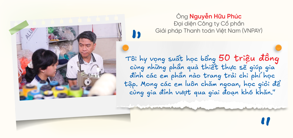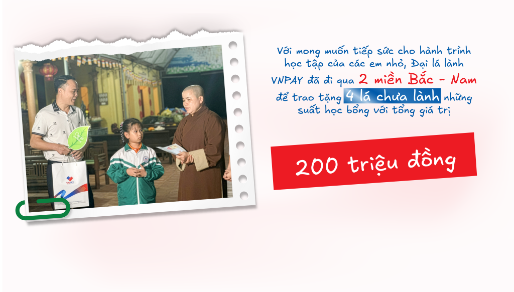 Thông qua Cặp lá yêu thương, VNPAY đã trao tặng những món quà thiết thực cho bốn lá chưa lành, cụ thể là suất học bổng 50 triệu đồng cho mỗi em. Sự hỗ trợ ấy sẽ giúp các gia đình phần nào trang trải chi phí học tập, đồng thời mang lại cho các em sự an tâm để tiếp tục đến trường, tiếp tục nuôi dưỡng ước mơ của mình.
