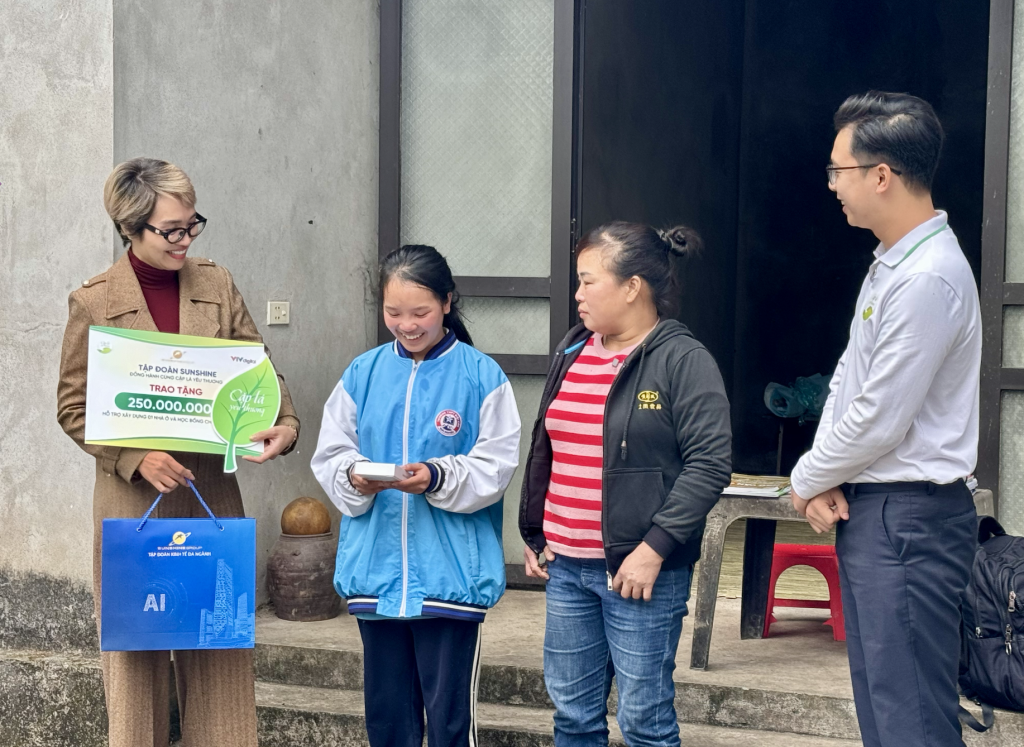 Niềm vui càng trọn vẹn hơn khi Sunshine Group trao tặng Thùy một chiếc điện thoại mới, suất học bổng cùng khoản hỗ trợ 250 triệu đồng để gia đình có thể sửa sang lại căn nhà, giúp cô bé có thể an tâm học tập trong một không gian an toàn hơn.