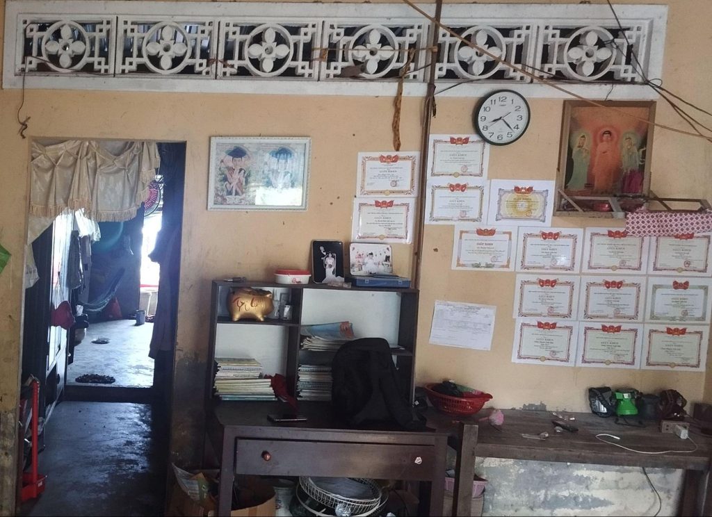 Ngôi nhà nhỏ của em nằm bên sông, muốn về phải băng qua cây cầu tạm. Tường vách chắp vá bằng lá và tôn rỉ sét, sàn được lót vỏ bao bì cũ kỹ. Mỗi khi trời mưa, bà luôn ngồi chỗ thấm ướt để nhường nơi khô ráo nhất cho Ngọc học tập, nghỉ ngơi.