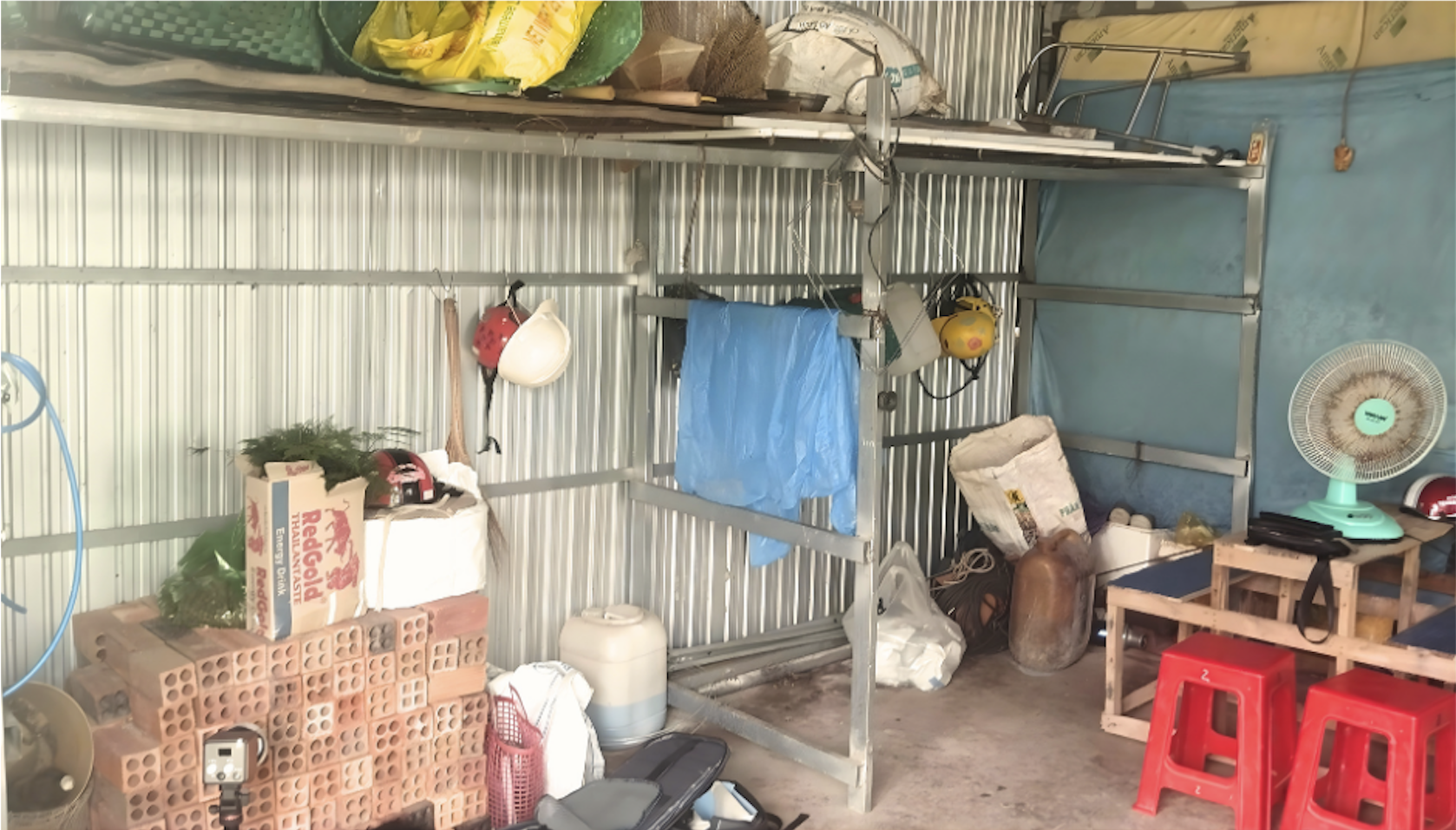 Ngôi nhà của ba ông cháu được ghép từ những tấm tôn mỏng manh, chẳng đủ sức chống chọi với bão giông. Mọi góc nhà đều xập xệ, đồ đạc đơn sơ, góc học tập của hai anh em Trúc Lam cũng chỉ là một khoảng nhỏ tạm bợ.